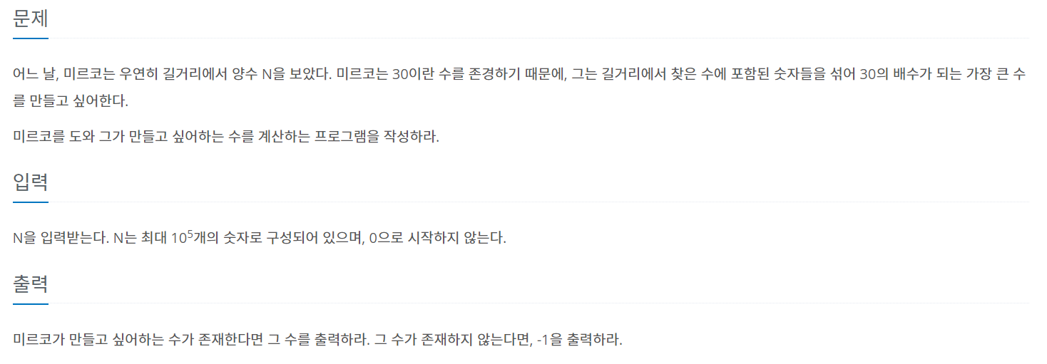 1. 30은 10 * 3 즉 10의 배수이면서 3의배수여야 한다. 일의자리가 0이 들어가지 않으면 10의 배수가 아님으로 -1 출력